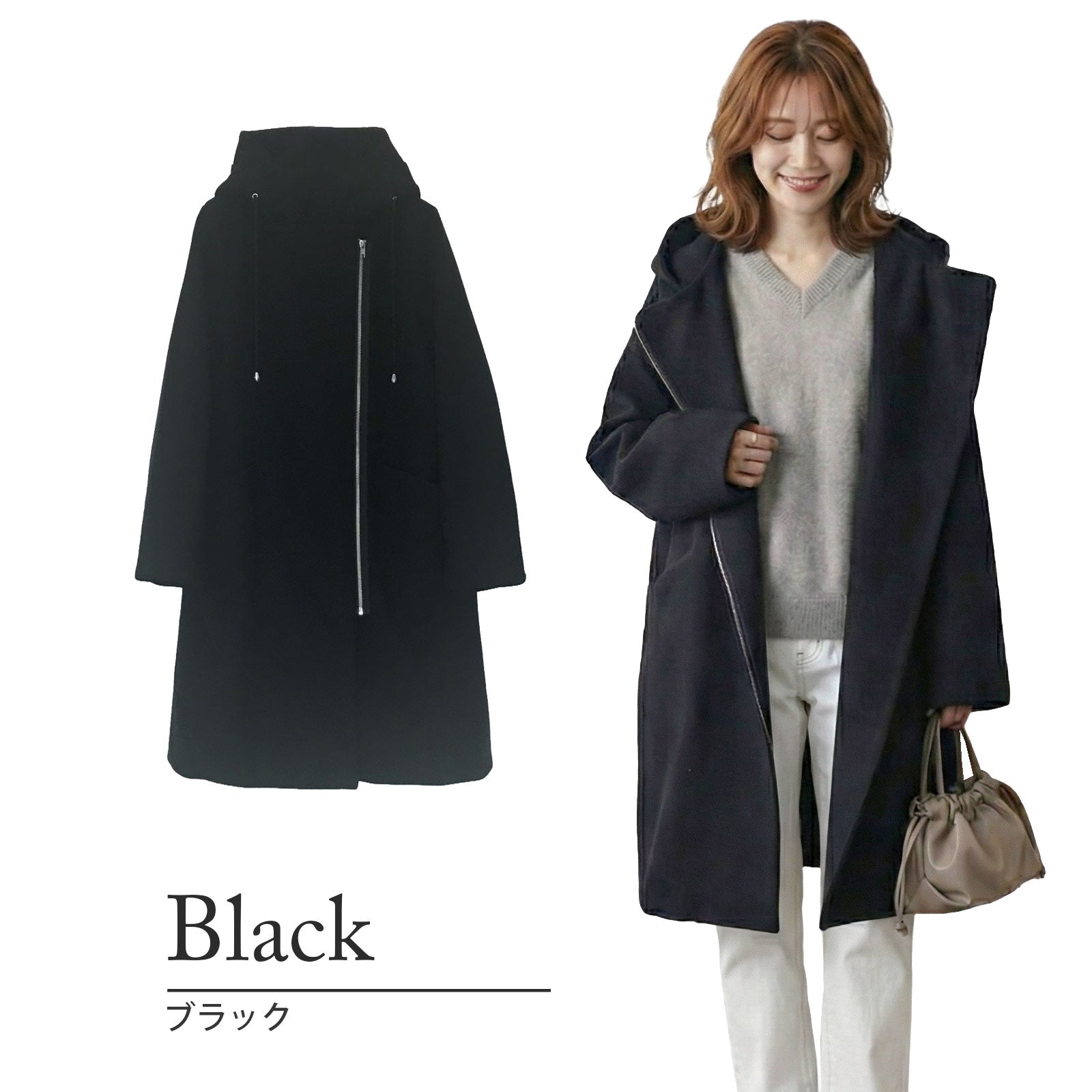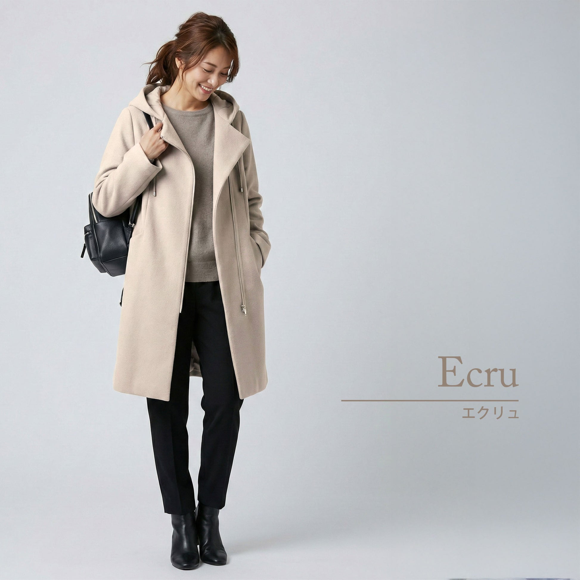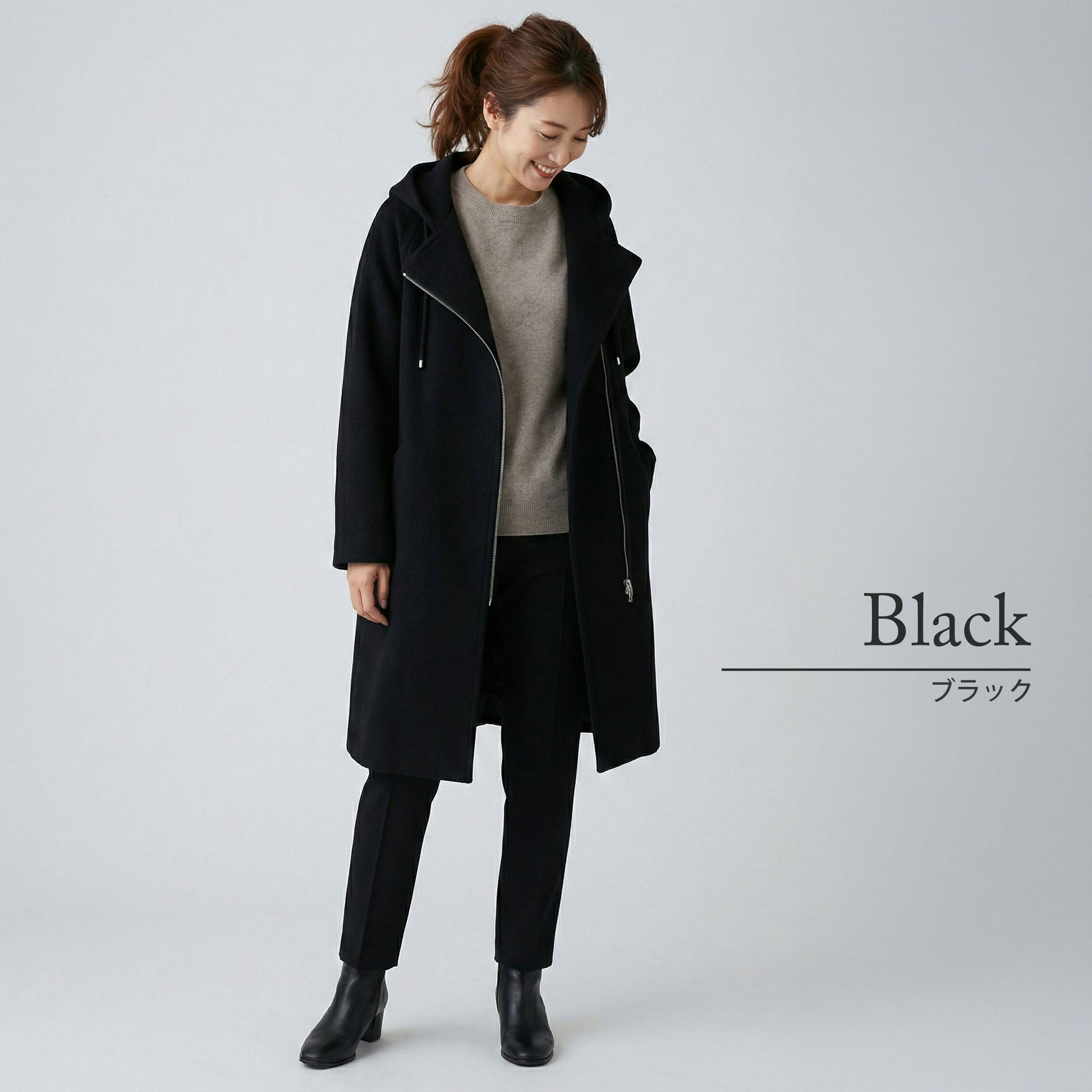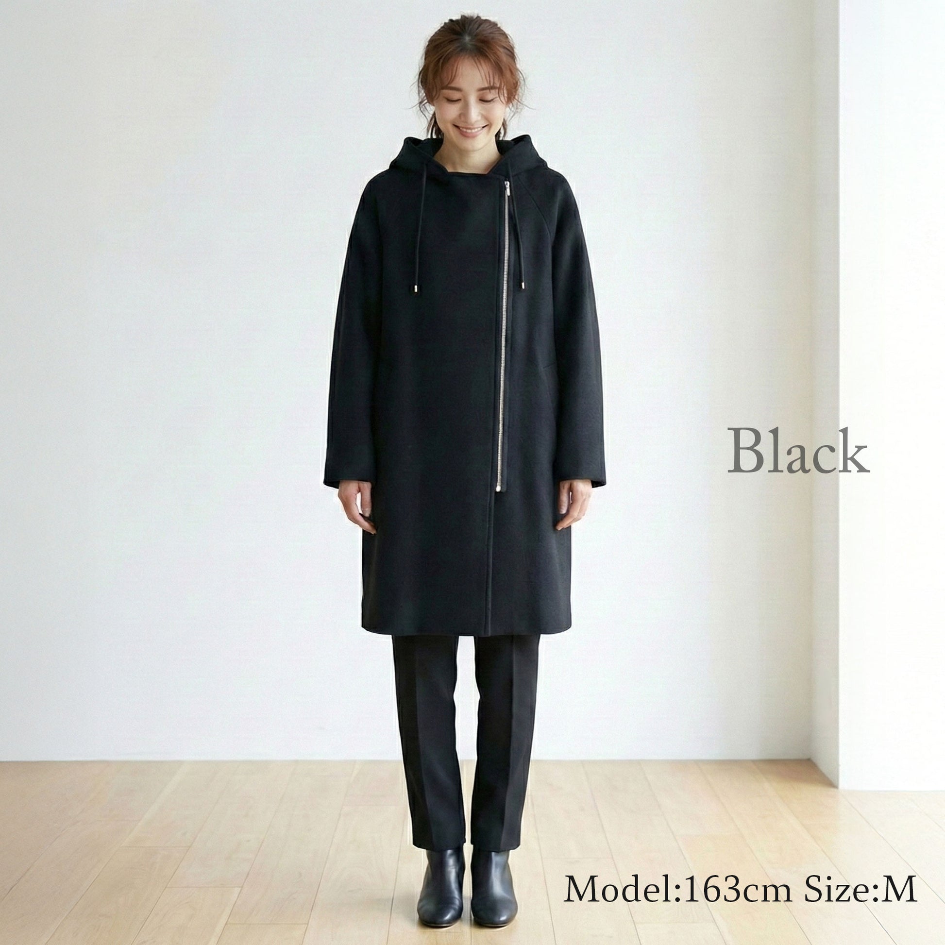 ドライクリーニングできます。厚みがありながら軽量でソフトなフラノ調フェイクウール素材。総裏地(タフタ)。フード付き。フードに絞りヒモあり。前ジップファスナー開閉。サイドポケット有り。日本ブランド商品、今季新作。生産国:ミャンマー。