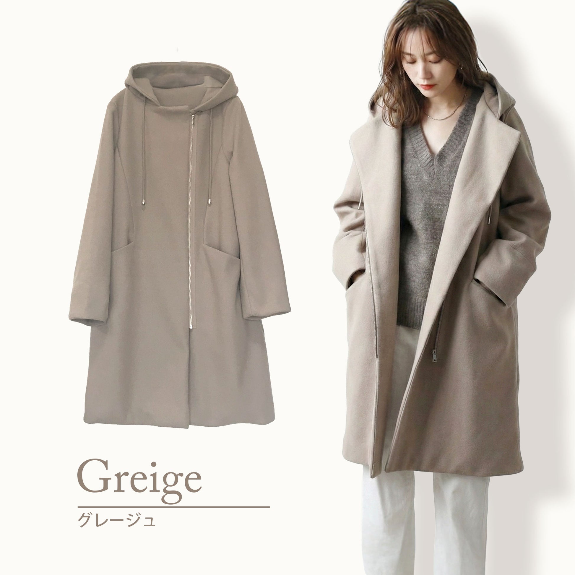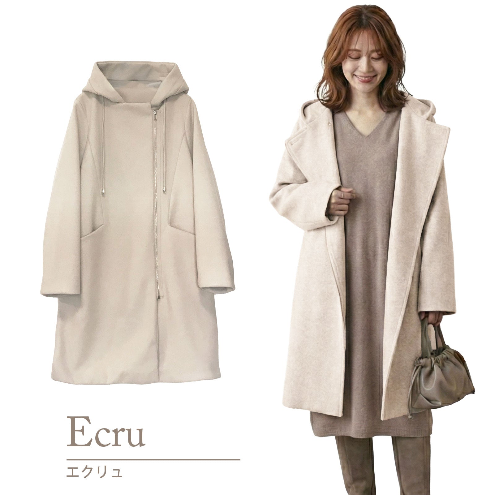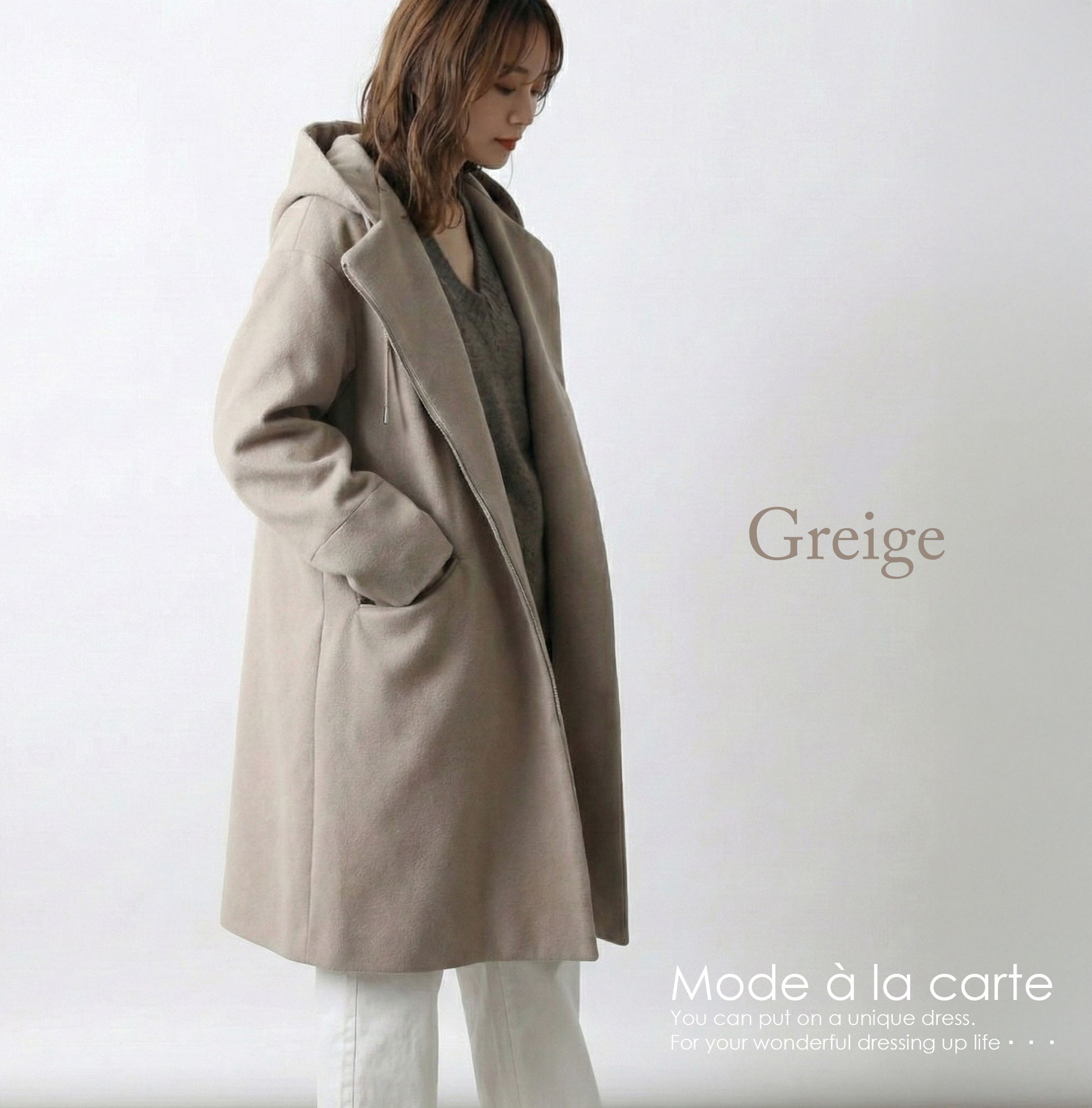 ドライクリーニングできます。厚みがありながら軽量でソフトなフラノ調フェイクウール素材。総裏地(タフタ)。フード付き。フードに絞りヒモあり。前ジップファスナー開閉。サイドポケット有り。日本ブランド商品、今季新作。生産国:ミャンマー。
