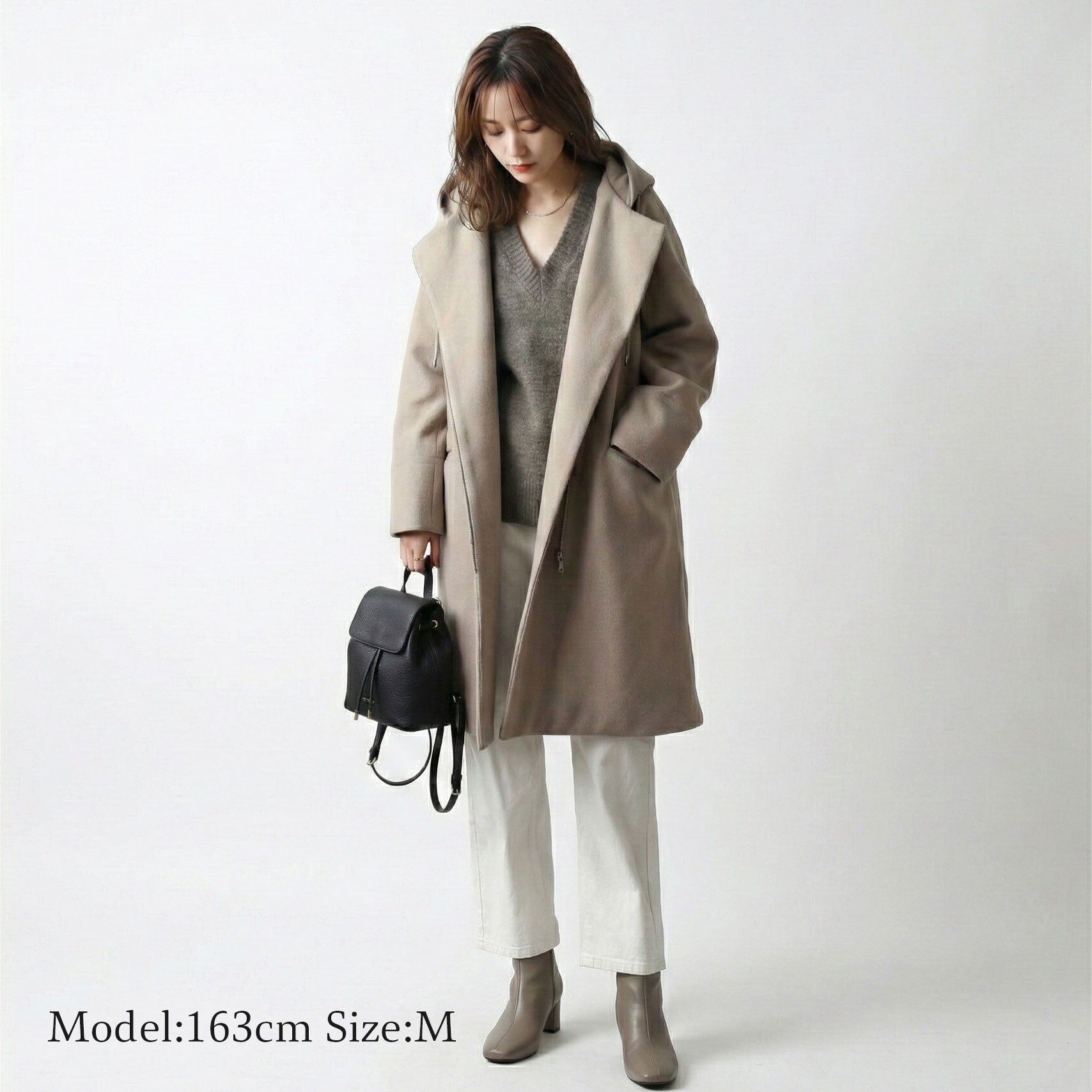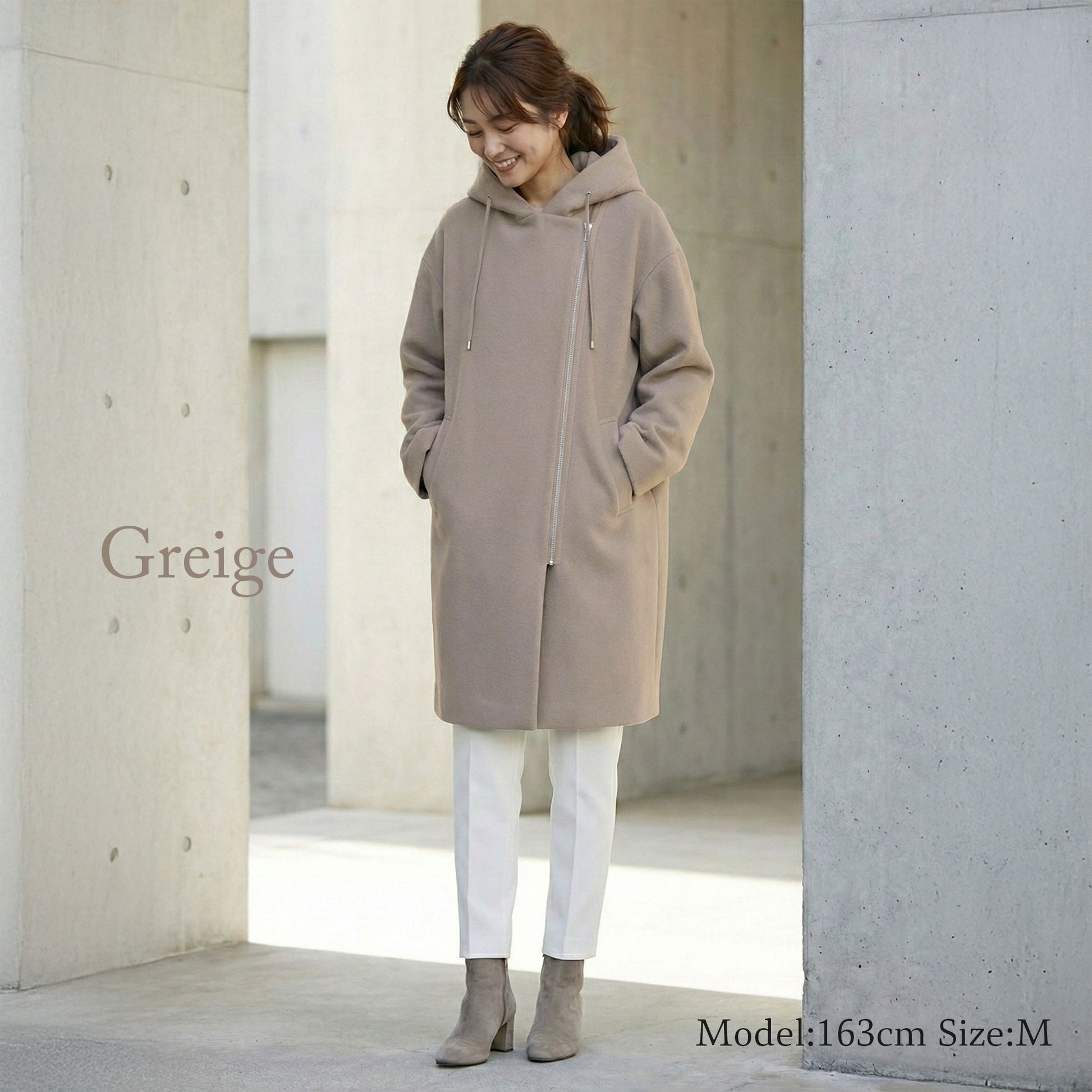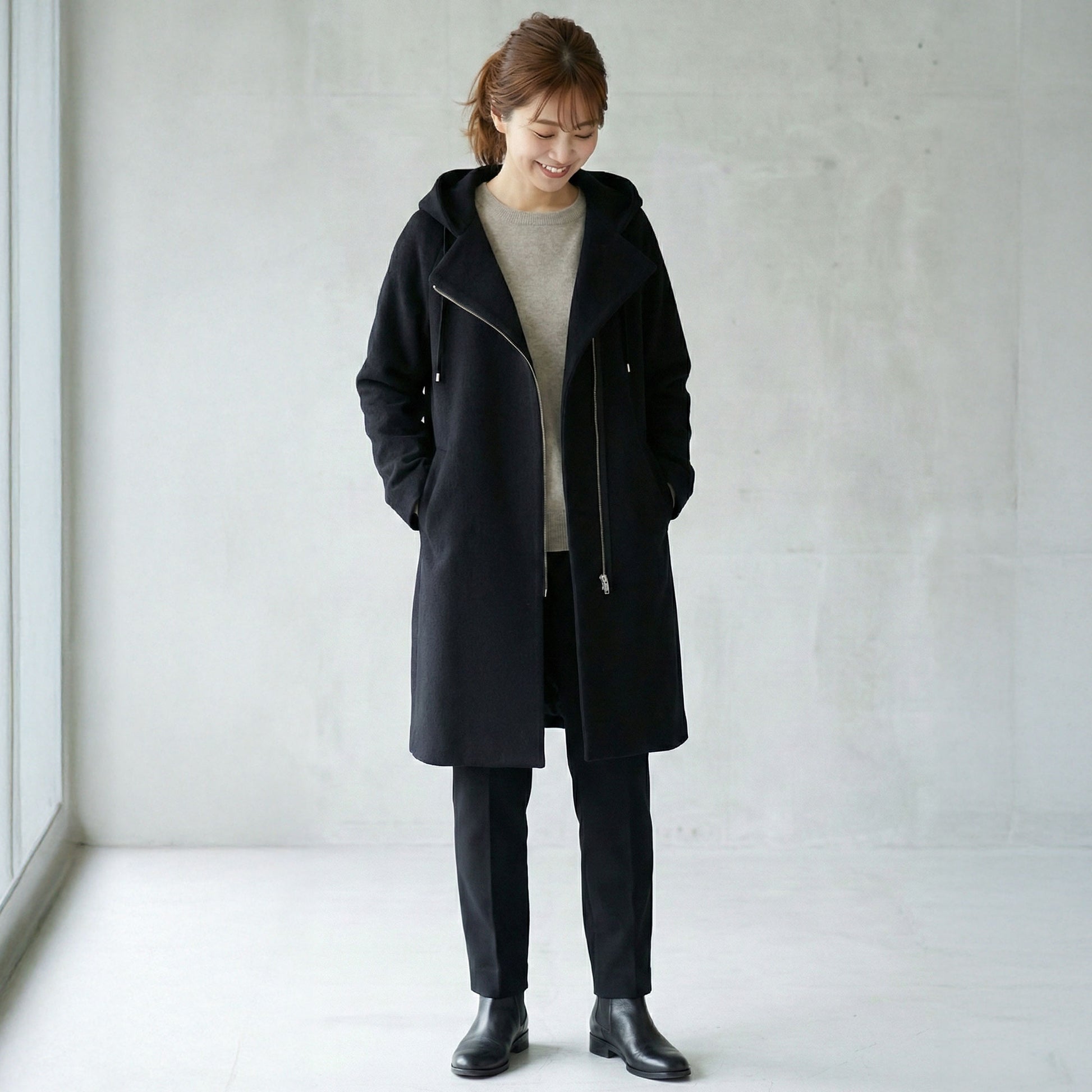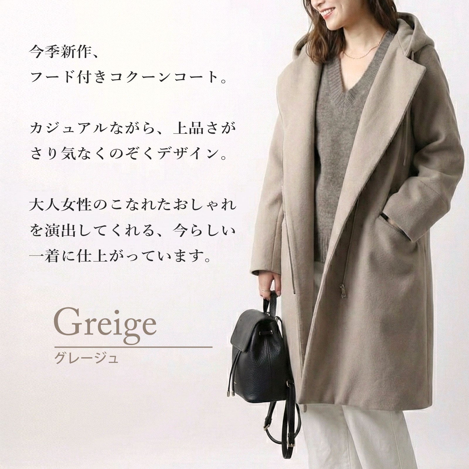 ドライクリーニングできます。厚みがありながら軽量でソフトなフラノ調フェイクウール素材。総裏地(タフタ)。フード付き。フードに絞りヒモあり。前ジップファスナー開閉。サイドポケット有り。日本ブランド商品、今季新作。生産国:ミャンマー。