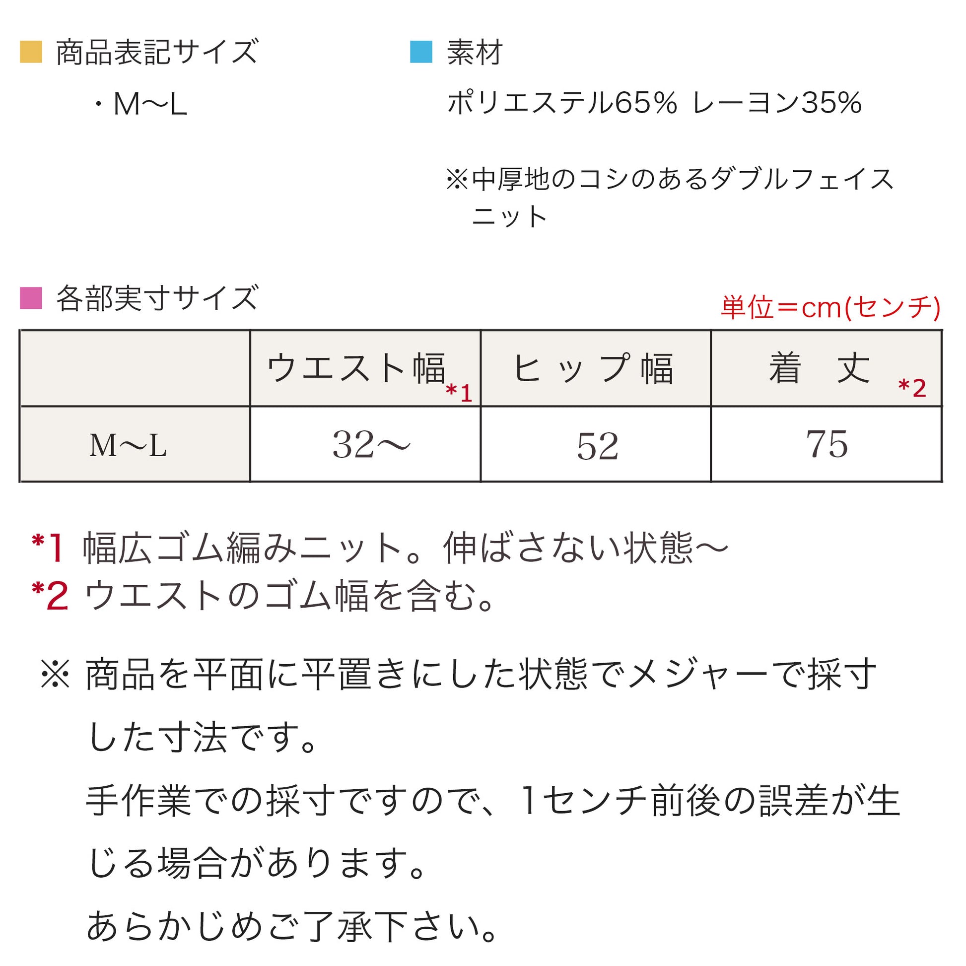 ご家庭でお洗濯できます。中厚〜厚手のコシのあるダブルフェイスニット。サラッとソフトな肌ざわり、タテヨコ方向に高い伸縮性があります。透け感なし。裏地なし。ウエスト幅広ゴム入り、ウエストゴム幅約5.5cm。日本ブランド商品。生産国:中国。