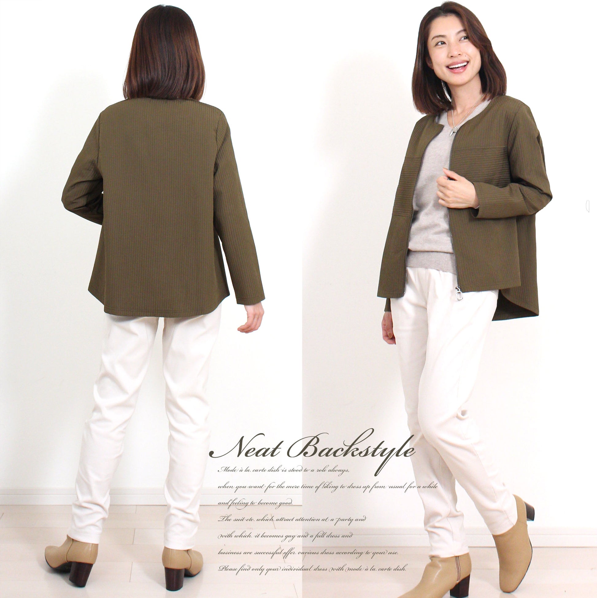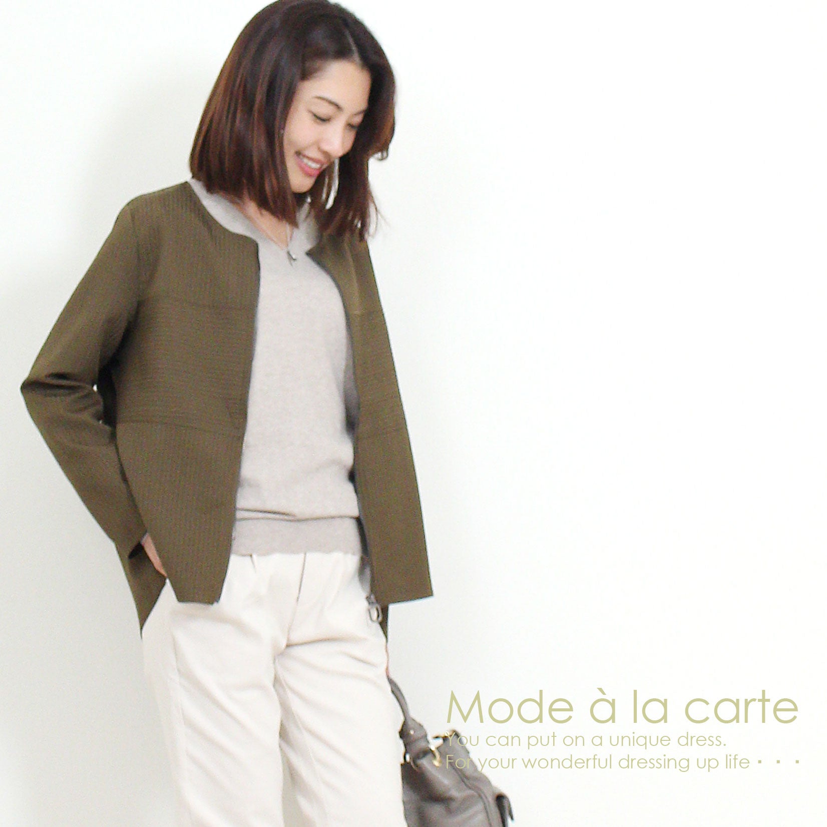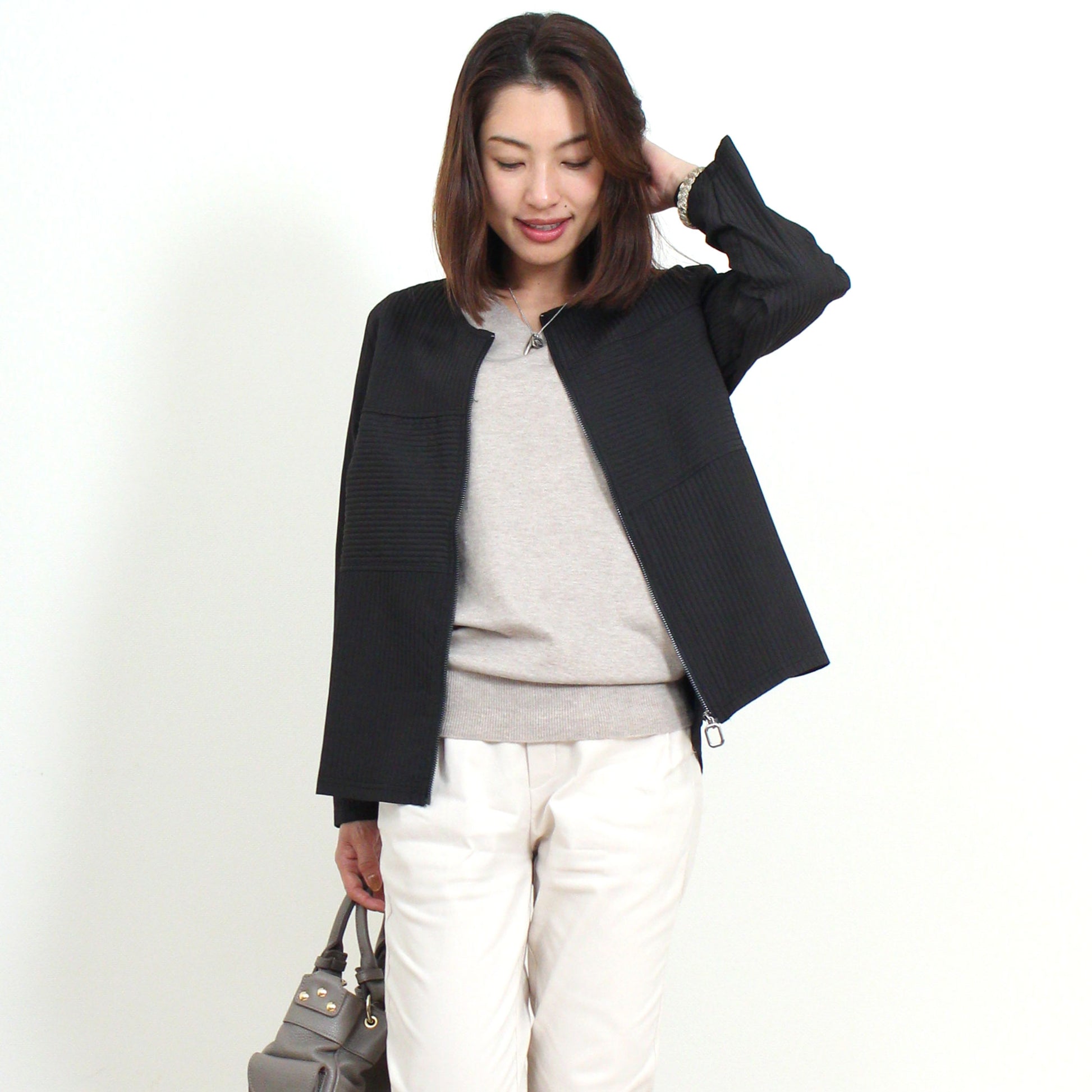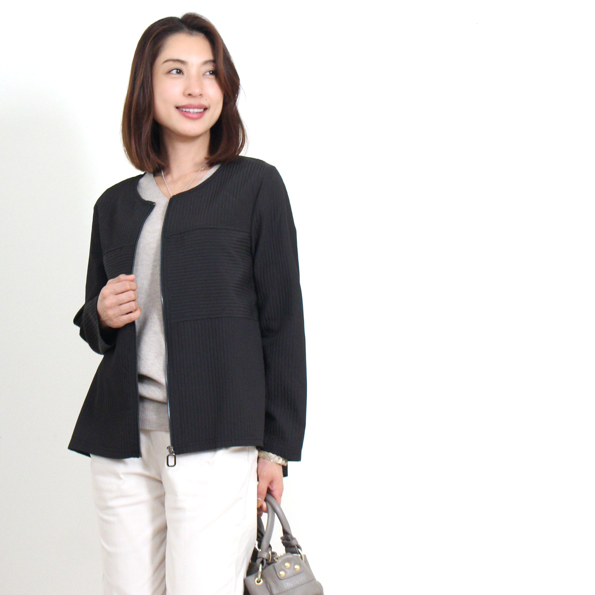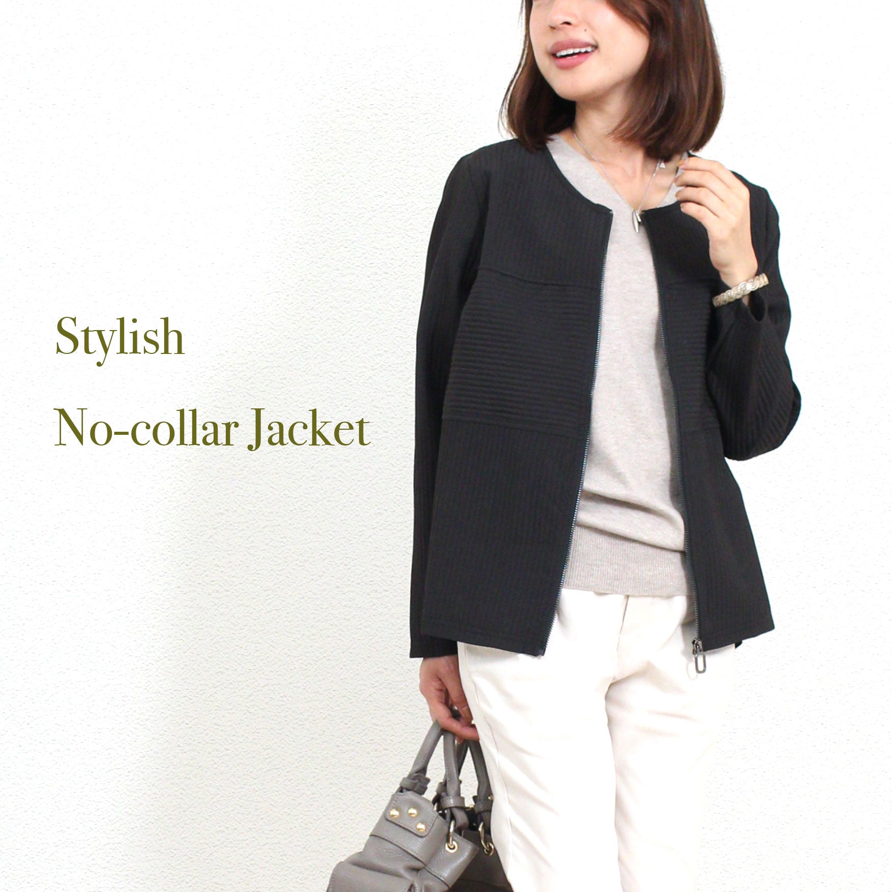 シンプルなデザインながら、しっかりと存在感のある長袖のノーカラージャケット。