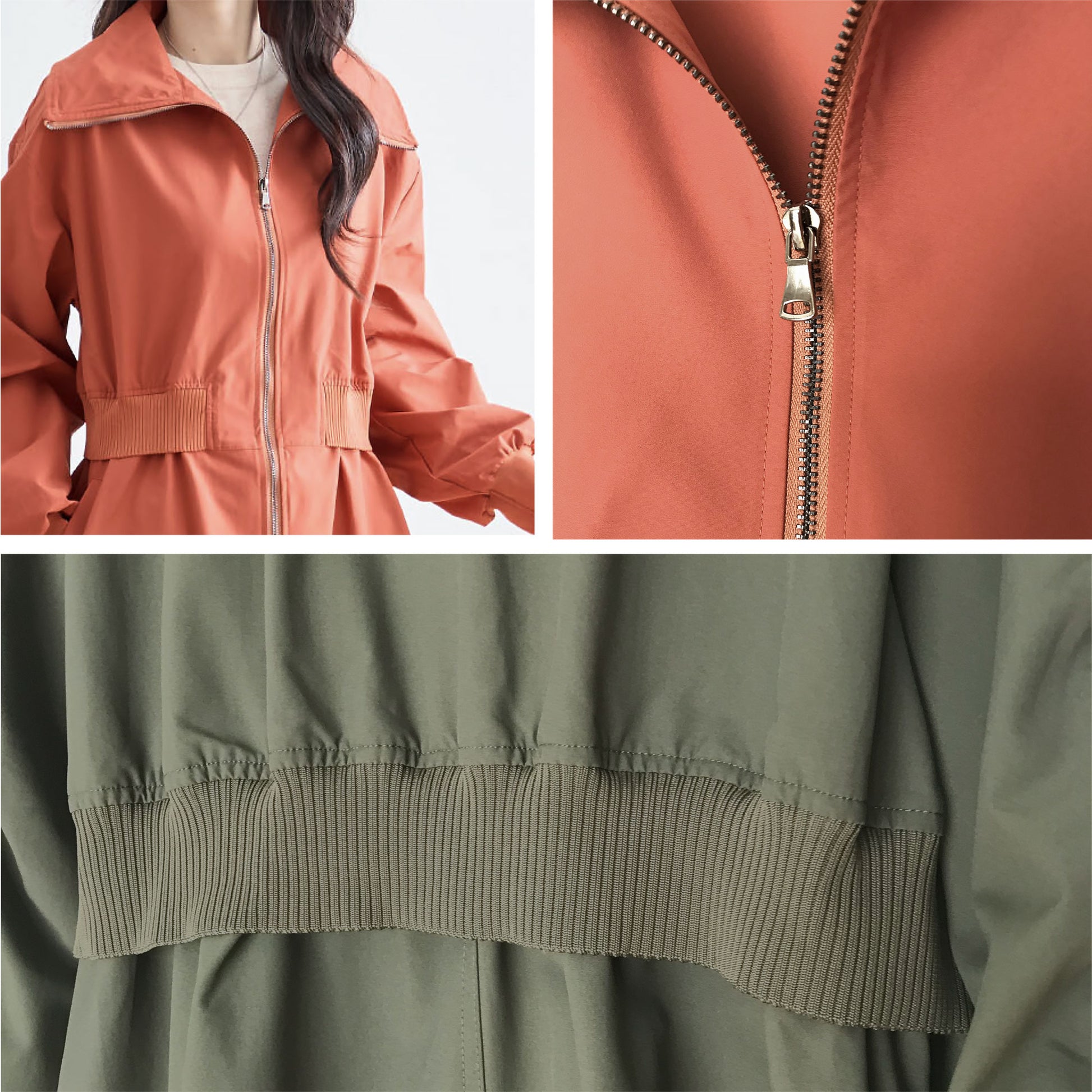 ご家庭でお洗濯できます。中厚のサテンタフタ生地(コート生地としては薄手です)。サラッとした肌ざわり。生地表面にうっすら霜が下りたようなマットな光沢感があります。タテヨコ(特にタテ方向)に高いストレッチ性があります。透け感なし。裏地はついていません。フロントジップ仕様。ウエストリブゴム(伸縮します)。サイドポケットあり。