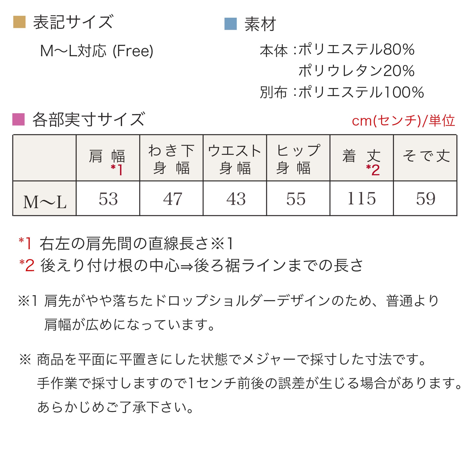 肩幅(*1)53、わき下身幅47、ウエスト幅43、ヒップ幅55、着丈(*2)115、袖丈59